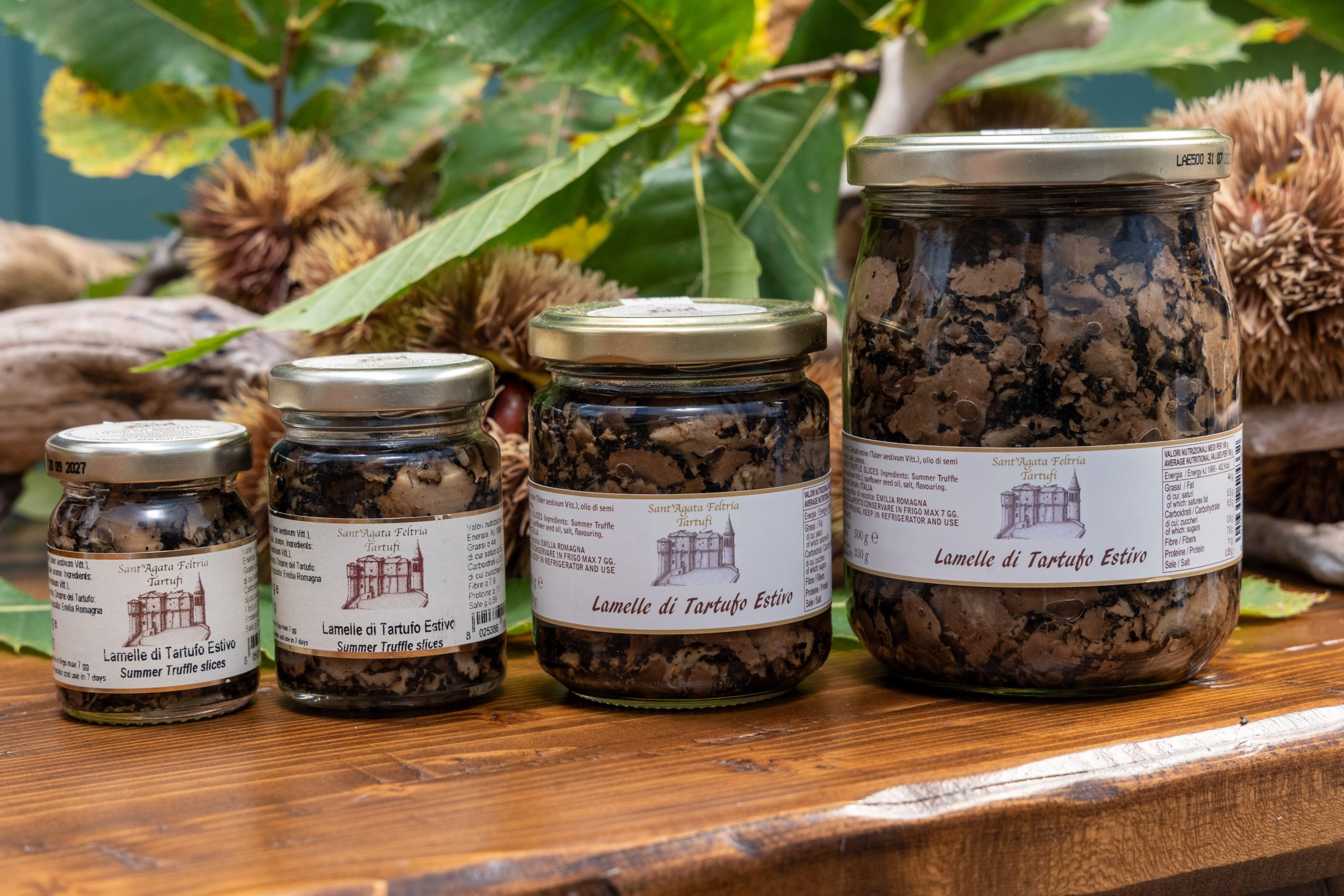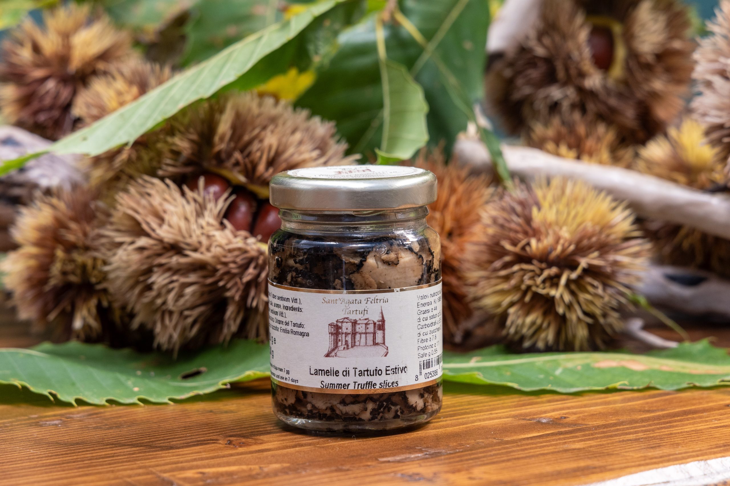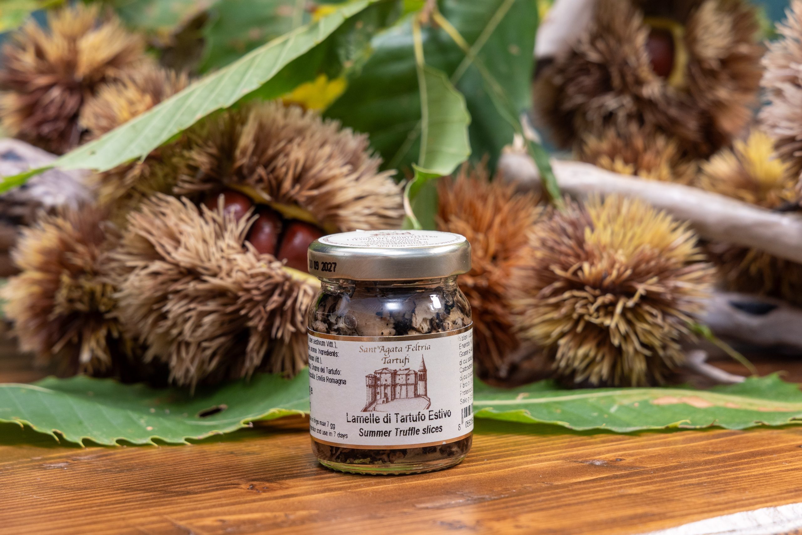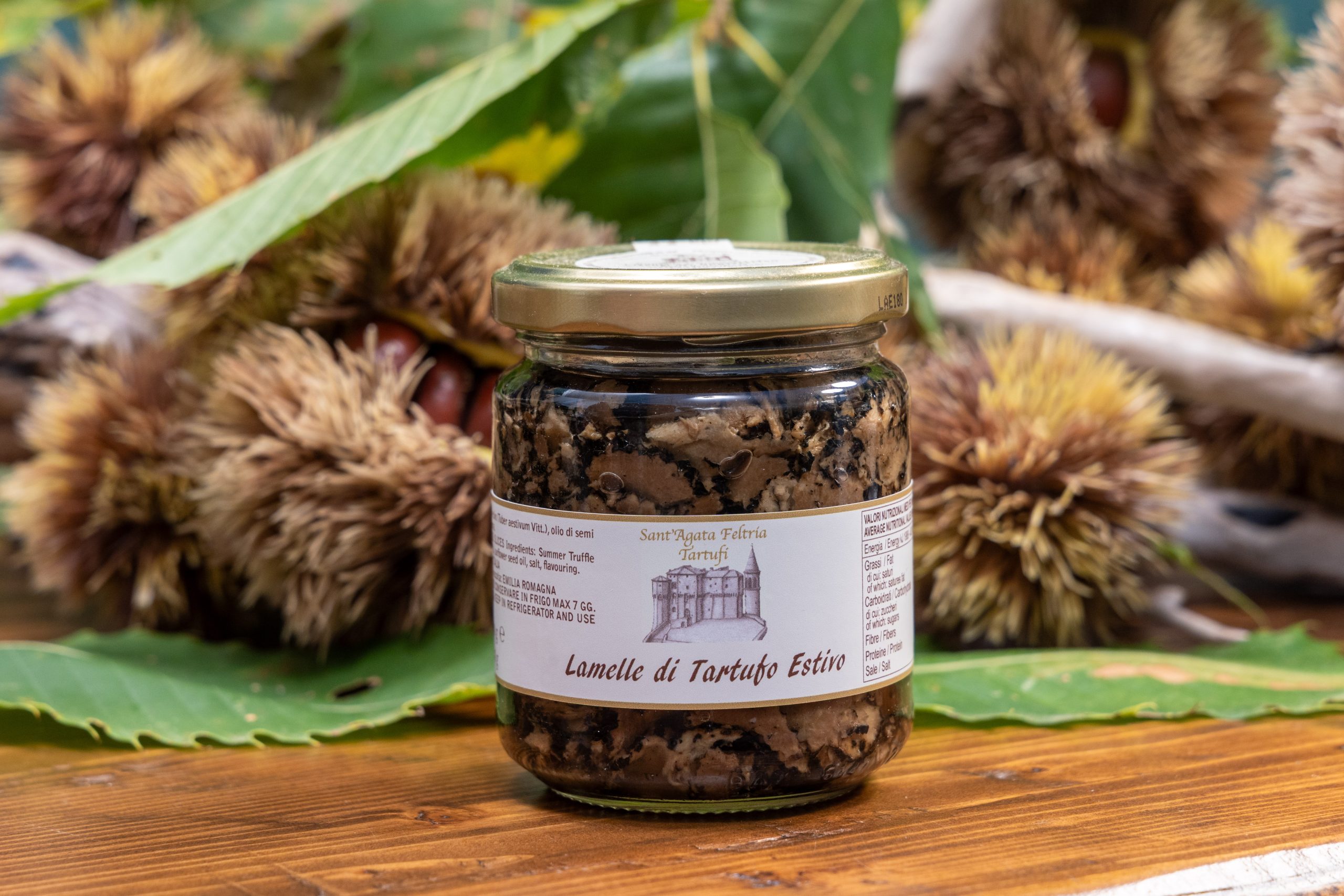 Le Lamelle di Tartufo Estivo di Sant’Agata Tartufi® sono il prodotto per chi vuole il tartufo vero — visibile, riconoscibile, autentico. Fette di Tartufo Estivo (Tuber aestivum Vitt.) conservate in olio di semi di girasole, pronte per trasformare qualsiasi piatto in un’esperienza gourmet.
