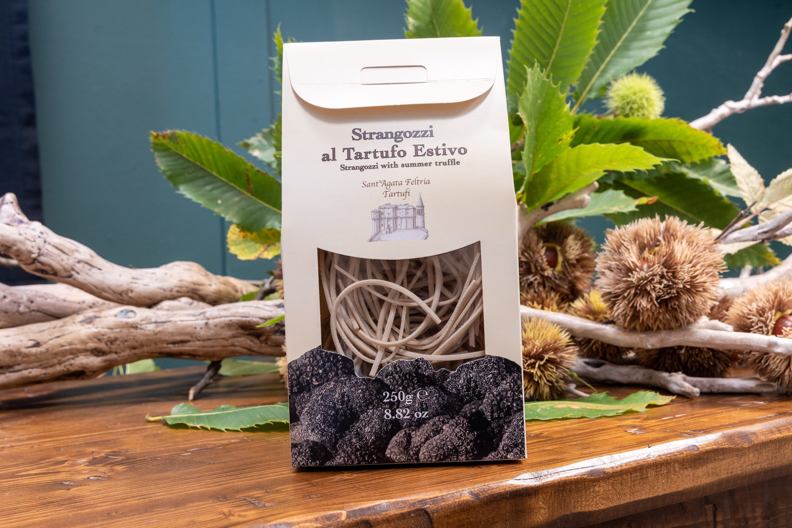 Semola di grano duro 100% italiano, Tartufo Estivo 2% (Tuber aestivum Vitt.) e Funghi Porcini (Boletus edulis) — essiccati lentamente a bassa temperatura per preservare intatto